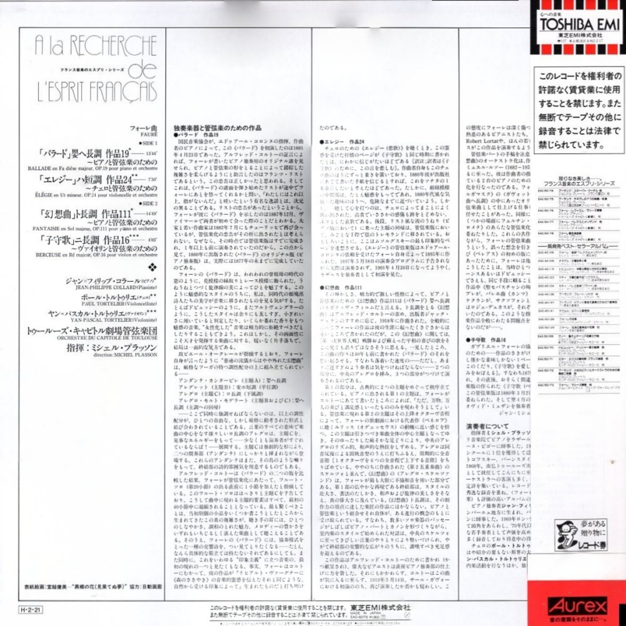 中古LPレコード:ミシェル・プラッソン フォーレ:「バラード」「エレジー」「幻想曲」「子守歌」 東芝EMI国内盤